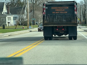 This truck saying "do not follow" was on the road to my home. I defied the truck and drove home behind it.