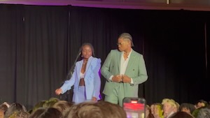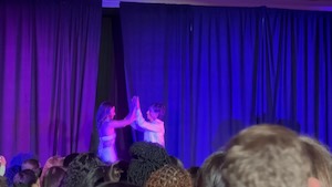 The whole audience applauded him as he and his friend walked out.