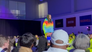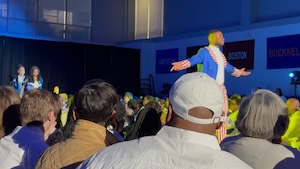 His friend in the blue said "get off your ass and fight this fascist president!"
