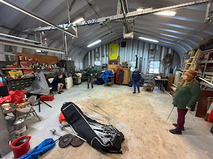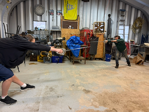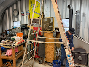 The first step was getting the heating fan on the wood stove working that involved extension cords, ladders and lots of folks working on it.