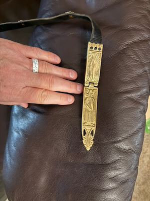 It’s a bit metal belt end. When I pulled up my tights, they got inside, not outside.